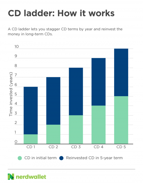 How it can work: Say you plan to buy a house in five years, so you put money in a five-year CD. Two years in, you can afford to put another chunk of money into a CD, and choose a new one that will mature around the same time as the initial CD. Four years in, you put more savings into another, much shorter CD. Once the fifth year ends, all CDs mature.