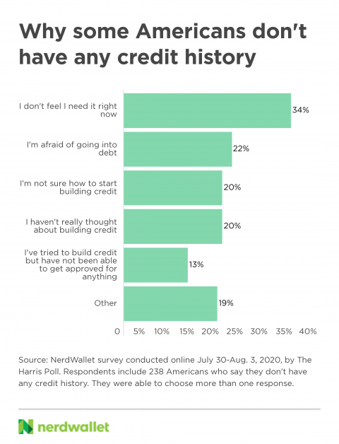 Around 1 in 8 Americans (13%) say they don’t have any credit history, according to a NerdWallet survey. They provided a variety of reasons: Some haven’t even thought about building credit, others want to do it but can’t gain traction and some are in the middle.