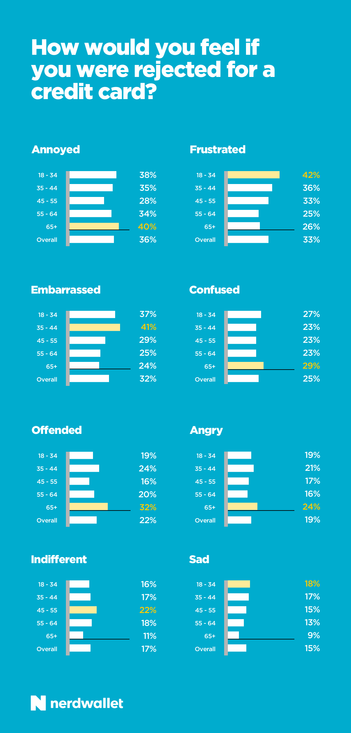 Rejection of any kind is fraught with emotion — sadness, frustration, embarrassment — and that includes credit card rejection. According to a new NerdWallet survey, most Americans (70%) say they would turn their back on a bank that rejected their credit card application and would not apply for another credit product from that bank. And many say a rejection would give them a darker view of credit card issuers in general, as well as of the overall state of their own finances.