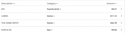 With credit cards, everything shows up on your account online in close to real time. Further, many issuers automatically categorize purchases according to the merchant: