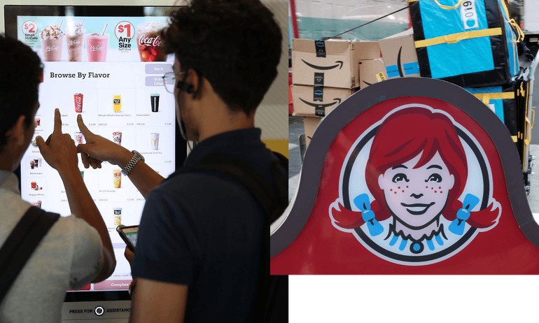 (Photo illustration images via Getty Images, clockwise from left: McDonald’s photo by Joe Raedle/Getty Images; Amazon by Spencer Platt/Getty Images; Wendy’s by Justin Sullivan/Getty Images)