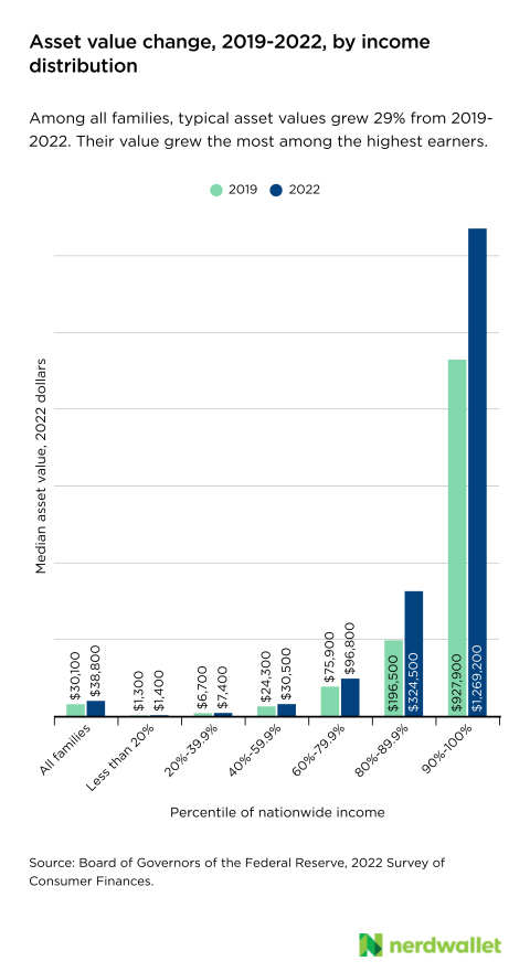 In addition to income, financial well-being is driven by wealth, and wealth is built with assets. From 2019 to 2022, the real median value of assets for the top-earning 10% grew 37%, from about $928,000 to $1.27 million, according to data from the Federal Reserve’s Survey of Consumer Finances. Meanwhile, the median value of assets among the lowest-earning 20% grew from $1,300 to $1,400, just 8%.
