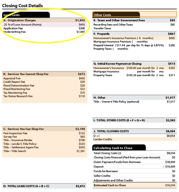 One important section to look for is at the top of Page 2, on the left-hand side of the page. That's where you'll see "Loan Costs" and "A. Origination Charges." You'll find two types of charges here: