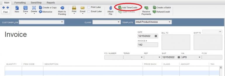 a. Add time/costs: If you have been entering billable time into QuickBooks Desktop, or if you have incurred costs and marked them as billable to the customer, you can automatically populate the invoice with this information by clicking this icon (shown in the image below).