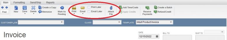 b. If you want to email your invoice, click the dropdown option under the email icon. (Note: If you want to email an invoice through QuickBooks Desktop, you have to set up the email preferences in settings.)
