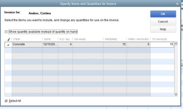 4. If you chose to create an invoice for selected items, you’ll see a new pop-up box that will allow you to choose what you want to invoice now. Choose the options that apply to you, then click the “OK” button.