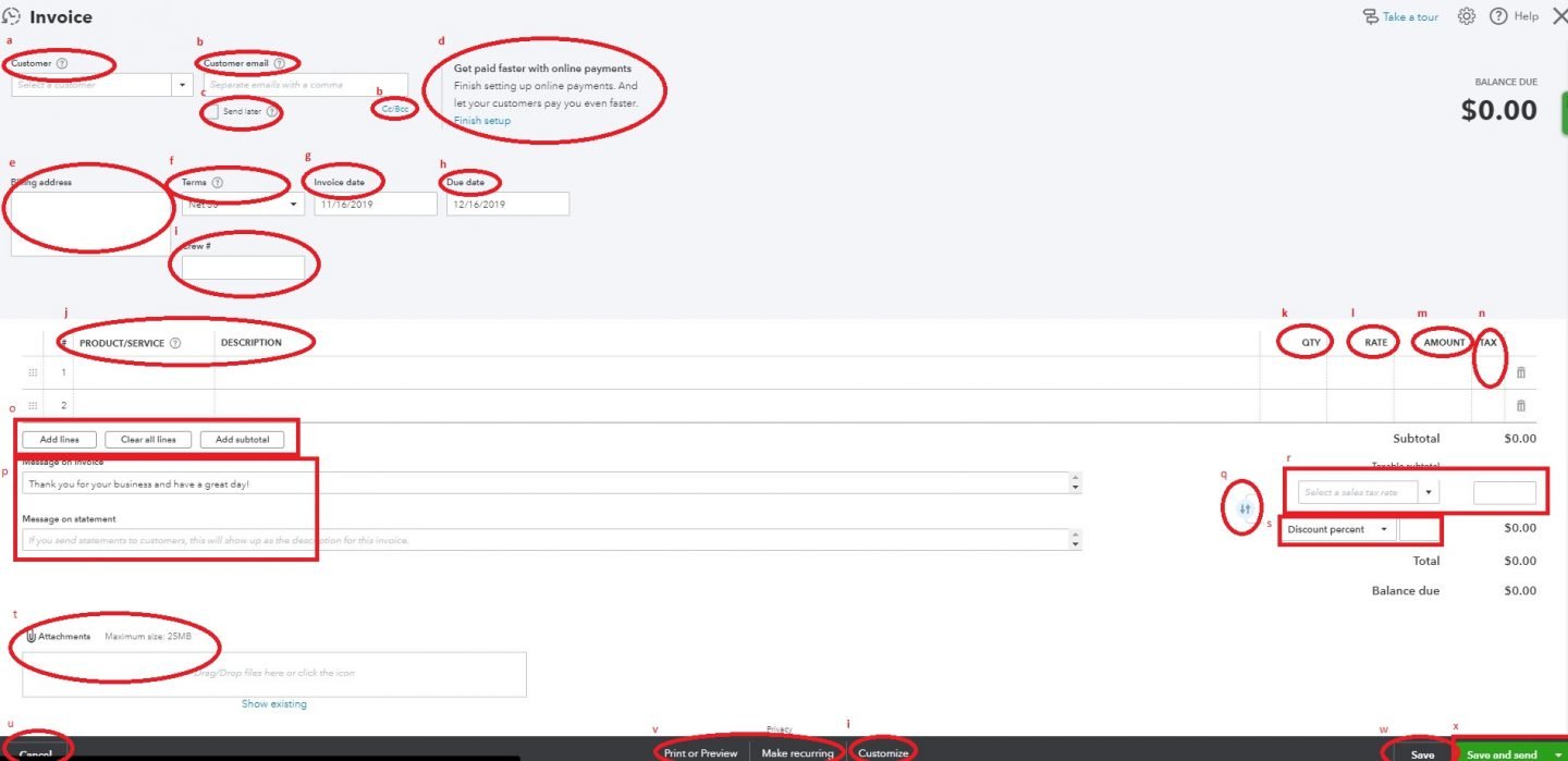 a. Customer message and memo: You can create the Customer Message field in advance, or you can enter a Customer Message right on the invoice. The Memo field is created manually for each invoice.