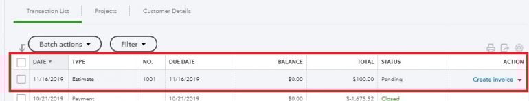 Locate the Estimate you wish to use to create your invoice and click on the “create invoice” link in the Action column.