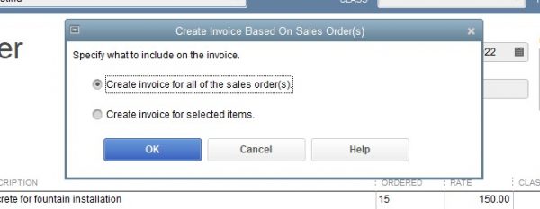 3. You’ll get a pop-up window asking if you want to create an invoice for all sales orders or just for selected items. Select the option that applies to you, then click on the “OK” button.