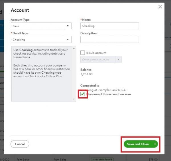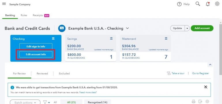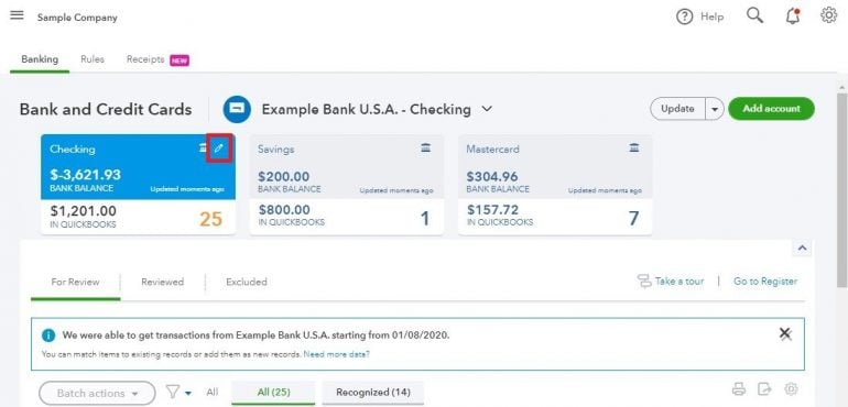 Rarely, you might have to disconnect the account from Banking altogether and then reconnect it. Before you proceed with the next step, match or accept any transactions currently waiting for you in the bank feed. Otherwise, they will be deleted when you disconnect the account.