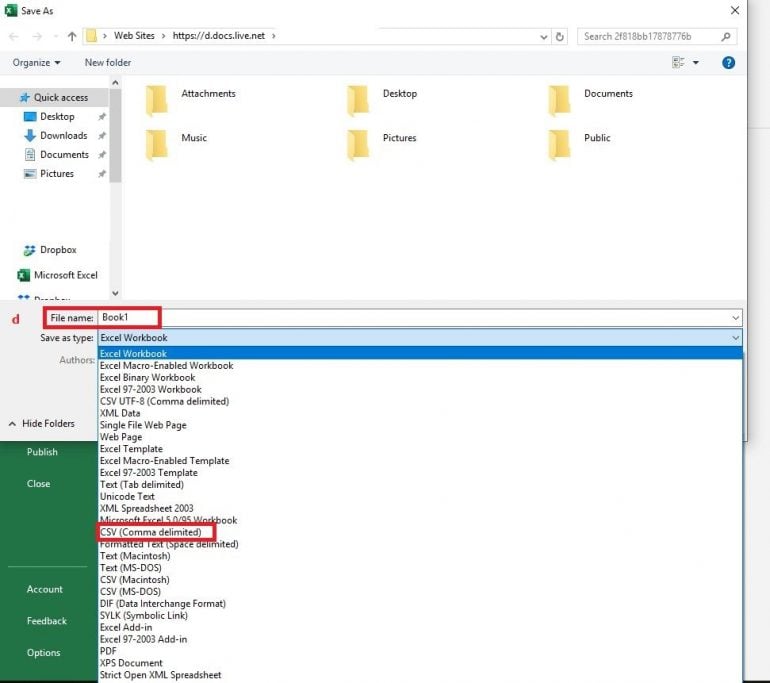 Change the File Name (if desired) and then change “Save as type” to CSV (Comma delimited).