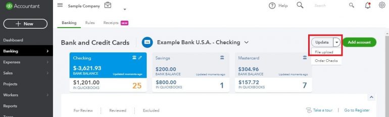 3. Now you’re ready to import your transactions into QuickBooks Online. Go to the Banking screen as in Step 1 to connect to your financial institution, but this time you’ll click the down arrow next to the Update button and choose “File upload.”