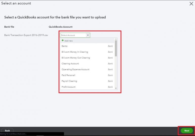5. Choose the account where you want to upload the transactions, then click Next. If the bank or credit card account where you are uploading the transactions doesn’t already exist in your chart of accounts, you can add it by clicking “Add new” at the top of the drop-down list.