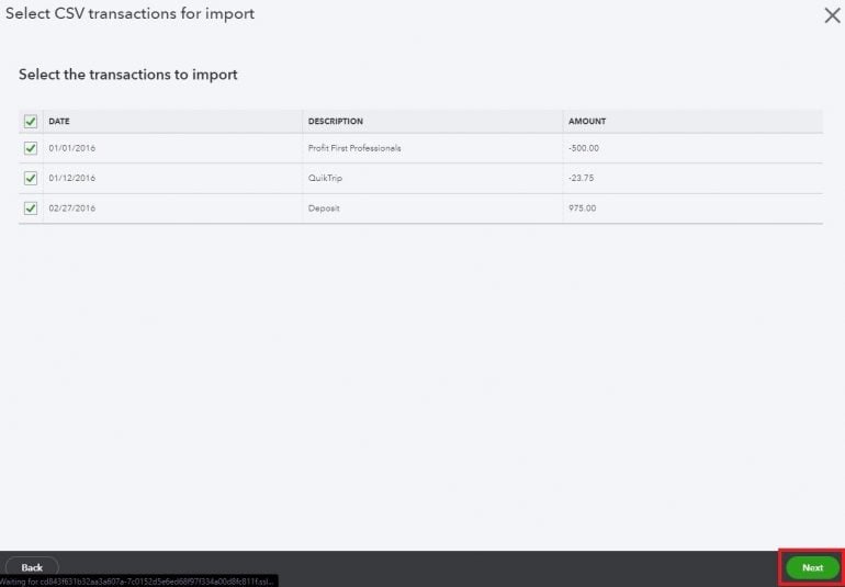 7. The next screen will give you a preview of the transactions you are about to import. The QuickBooks Online default is to select all transactions, and this is what we recommend unless you are certain there are duplicates in your CSV file. Make sure the data looks correct by comparing the data on this screen to the CSV you are using for the import, then click Next.