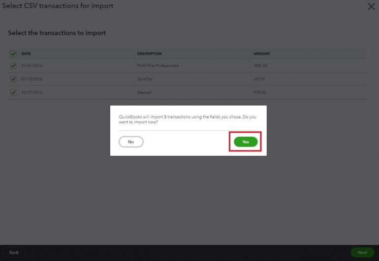 8. Now, you’ll see a pop-up box that tells you how many transactions will be imported. Click Yes if you are ready to complete the import. If not, click No. If you click No, you will have to start the import process again from Step 3 when you’re ready to proceed.
