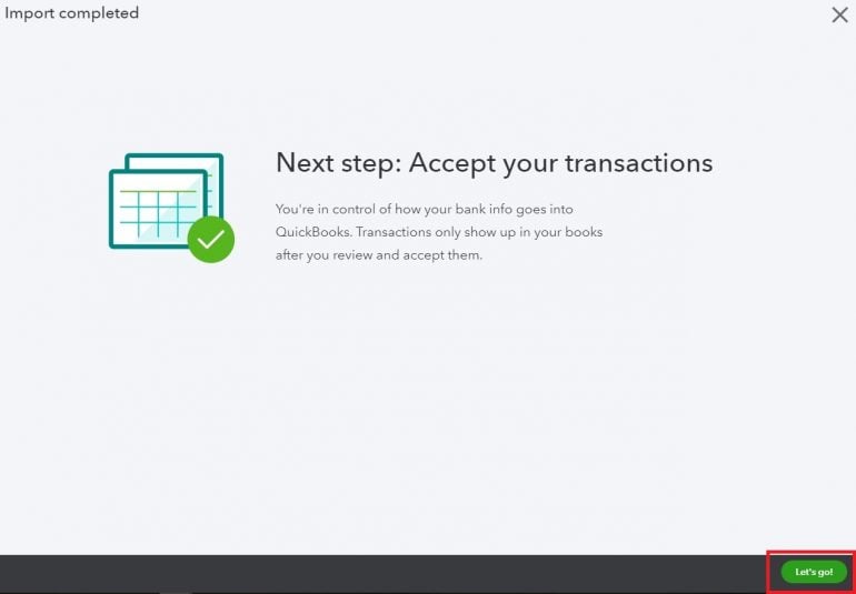 9. Once the import is complete, you’ll get a screen prompting you to accept your transactions. Click “Let’s go!” to be taken to the Banking screen to start matching or adding your transactions.