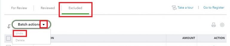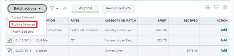 The selected transactions will be removed from your Banking screen. If you later discover they were not duplicate transactions, you can restore them by clicking on the Excluded tab, selecting the transactions you want to restore, and then using the “Batch actions” button to Undo the exclusion.