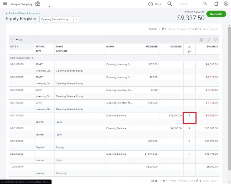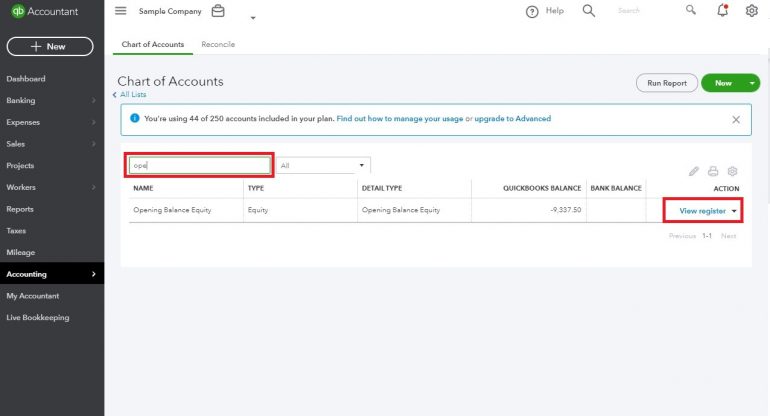 If you have difficulty with your first reconciliation after connecting to your financial institution, go to your chart of accounts and search for the Opening Balance Equity account. Click on “View register” to see the transactions in the account.