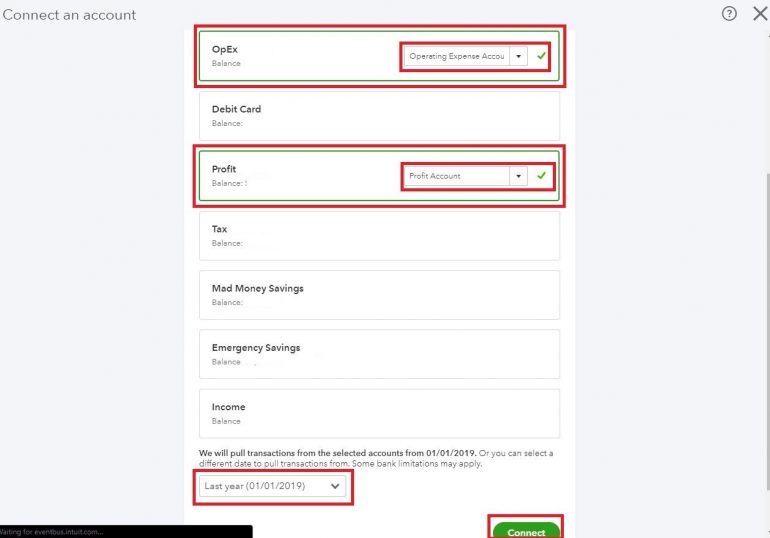 5. From here, you will get a list of accounts to connect. The current balance in each account will be shown (it's been redacted this on the screenshot for privacy). Select the accounts you want to use to import transactions into QuickBooks Online. If you have your personal accounts and your business accounts at the same financial institution, make sure to only connect your business accounts. This will keep your business and personal finances separate, which is crucial to good accounting.