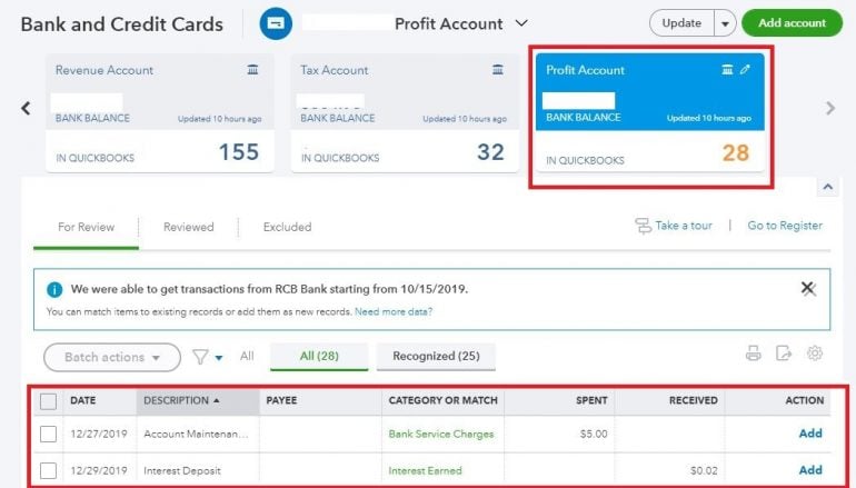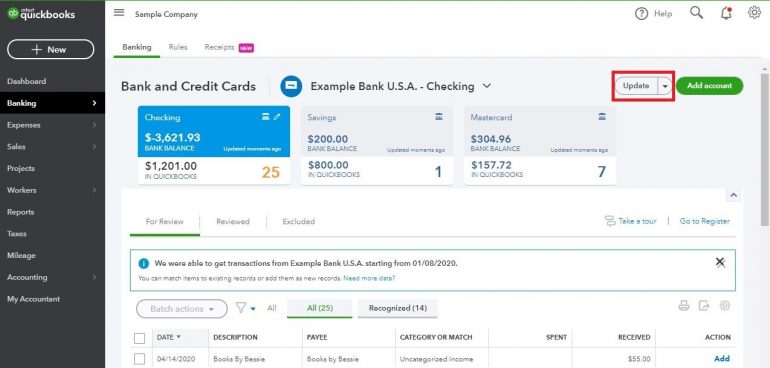 The Banking feature provides a way to reconcile your business’s bookkeeping to your bank’s records, almost in real-time. There is often a 24-hour lag in updates, depending on how your bank communicates with QuickBooks Online. Even with this lag, using the Banking feature to reconcile daily — or every few days — is still quicker than the traditional reconciliation method where you wait for your bank or credit card statement to arrive in the mail. This quicker reconciliation gives you an opportunity to detect certain problems — like an unexpected overdraft or potential fraud — much sooner than waiting until the end of the month when your bank or credit card statements arrive.