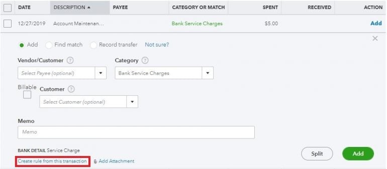 7. As you’re adding or matching your transactions, you can create rules in order to expedite this process moving forward. Rules are especially helpful for recurring automatic transactions you might not have receipts for, like bank fees and subscriptions. Click into a transaction — in this case, we chose the “12/27/19 Account Maintenance” transaction — and then click “Create rule from this transaction.”