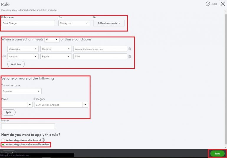 Now you can set the conditions you want to use to apply the rule. We recommend using the “Auto-categorize and manually review” option so you still see the transaction in your bank feed, but it’s automatically categorized based on the rule. This helps prevent misclassification errors and duplicate entries. When you are done setting the conditions, click Save to apply the rule and return to the Banking screen.