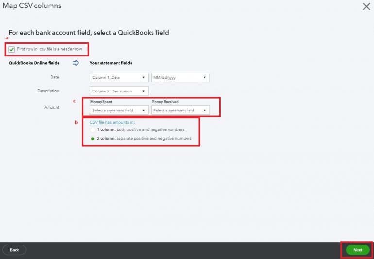 You have an option to indicate that the first row in the CSV file is a header row (a). This will usually be the case but double-check your CSV to make sure there isn’t data that needs to be imported in Row 1. You will also need to indicate whether your credits and debits are in one column or two columns (b). If your debits and credits are in separate columns, you will need to map those columns separately (c).