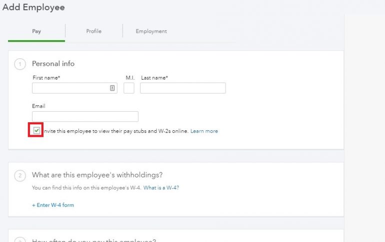 If you can provide pay stubs electronically under your state’s laws, your employees can access them by visiting the QuickBooks Workforce website at workforce.intuit.com. When you create your employees’ profiles in QuickBooks Online using the “Add an employee” button (see above), you have the option to invite the employee to view their pay stubs and W-2s online (you must get employee consent to deliver W-2s online). Entering the employee’s email address and then clicking the checkbox next to this option will send the employee an invitation to the QuickBooks Workforce site.