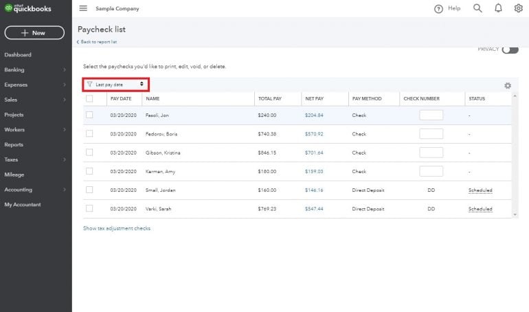 The default setting for this screen is to show all paychecks for the last payroll run. You can change this setting to show previous paychecks by clicking on the filter drop-down box (highlighted above.)