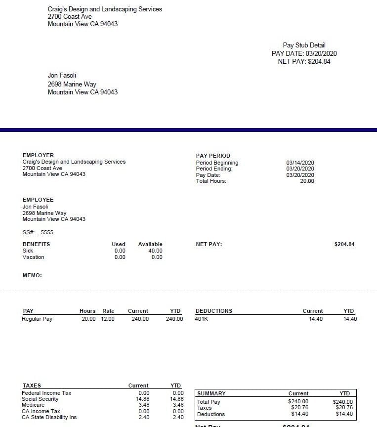 Pay stubs provide your employees with a detailed breakdown of their earnings, benefits, taxes withheld and the taxes you as an employer pay on their behalf. In QuickBooks Online, the pay stub looks like this: