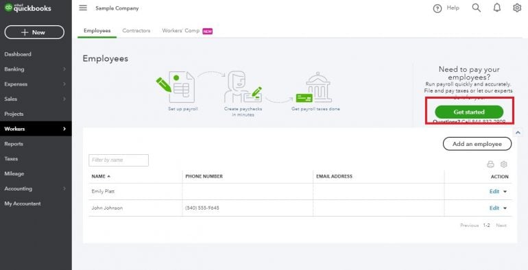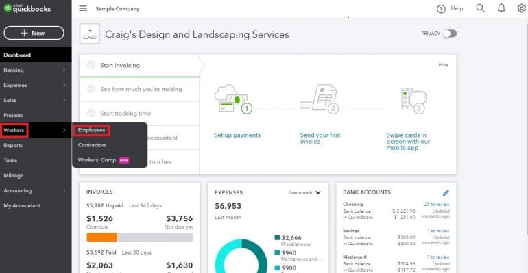 Now that you know why you should prepare pay stubs for your employees, let’s walk through how to print pay stubs in QuickBooks Online. First off, make sure you have QuickBooks Payroll turned on in QuickBooks Online. To turn on QuickBooks Payroll, hover over “Workers” on the left-hand side of the dashboard screen, then click “Employees.”