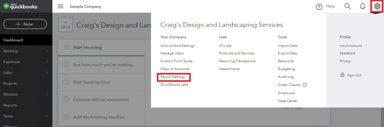 Once you have activated your QuickBooks Payroll subscription, you’ll need to create your payroll settings. Click on the Gear icon at the top right corner of your screen, then click on Payroll Settings.