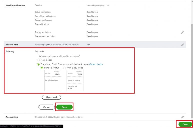 Next, select your printing options. If all of your employees are paid via direct deposit, you can choose the “plain paper” option. Otherwise, choose your check stock type (either one stub or two stubs) and then save. To finish entering your payroll settings, click “Done.”