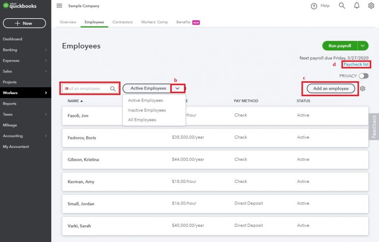 Your Employees screen now shows a list of your employees. You can search for an employee in the search box (a), or you can sort your list by Active Employees, Inactive Employees or All Employees (b). Use the “Add an employee” button (c) to set up a new employee from this screen.