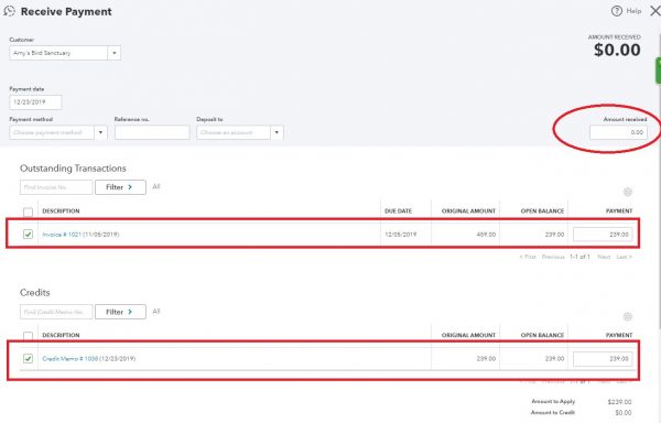 On the next screen, you’ll have the option to select the outstanding credit memo as part of your payment. The amount of the payment after the credit memo is applied should be $0. This will result in a $0 transaction in your check register, which you can clear the next time you reconcile the bank account.