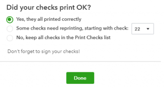 Don’t say yes until the check(s) are completely printed. As luck would have it, the minute you say yes and anything isn’t finished, that’s going to be when your printer decides to eat 10 checks. To reprint them, you’ll have to open each one that didn’t print individually and mark it to be printed and do it all over. No one wants that!