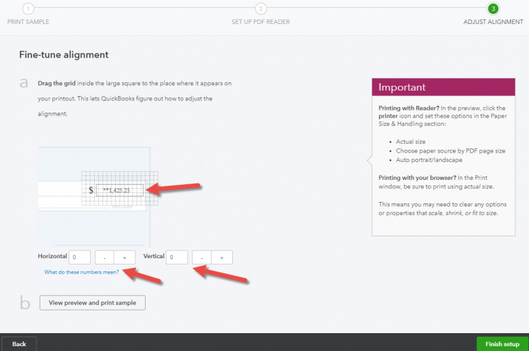 Click on “No,” continue setup to get to the amount alignment field. If you know the actual horizontal and vertical, you can enter them or hit the “+/-” keys. You could also just grab the dollar amount using your mouse and drag it into position. Then click “View preview and print sample” and keep trying until you get it aligned how you like. Then click “Finish Setup.” Voucher and standard check stock are both supported.