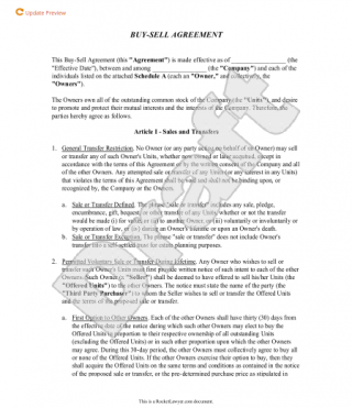 For those not quite ready to hire a lawyer, there are free buy-sell agreement templates available that can help you get the ball rolling. As your business grows, it’s smart to have a lawyer draft up an agreement, but for new business owners this can be a more cost-effective way to get started. For example, Rocket Lawyer offers a free buy-sell agreement template for each state.