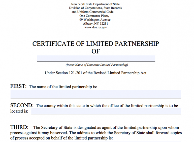 If you decide that you want to form a limited partnership, then you’ll have to file a certificate of limited partnership with your state’s secretary of state office. The certificate of limited partnership contains the following basic information about your company: