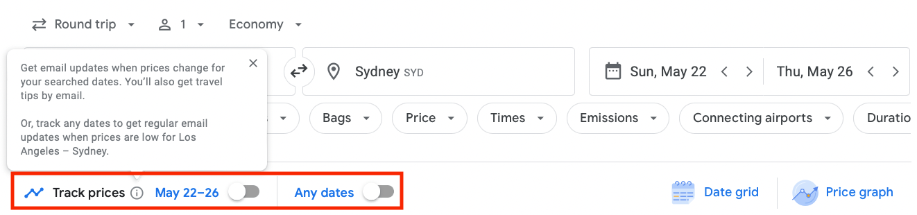 If the flight you’re considering does appear to be expensive, Google Flights also features a price tracker alert system that will email you when fares drop. You can toggle this feature on within the search bar.