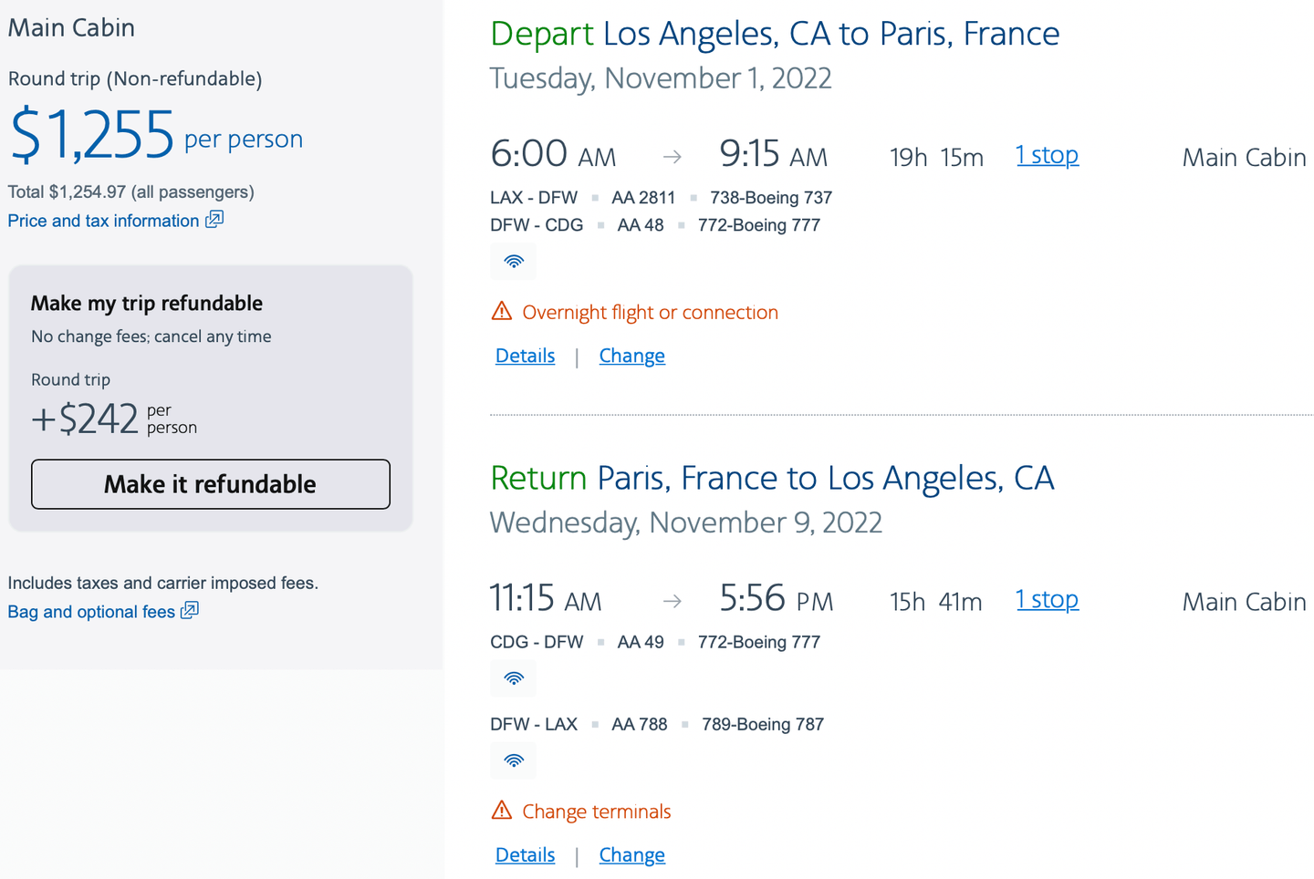For example, a round-trip flight from Los Angeles to Paris costs $1,255 at the beginning of November 2022.
