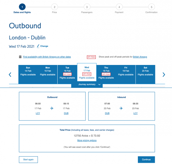Use British Airways' rewards flight finder to find available options to book. Once you select a specific journey, you’ll see the total amount of Avios points needed to book the flight, plus the cash total for taxes, fees and carrier charges.
