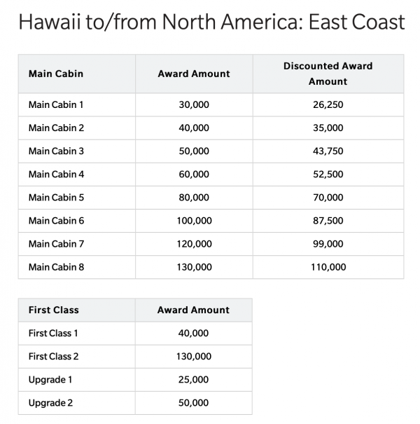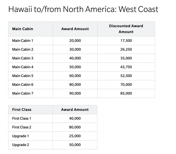 If you have a stash of Hawaiian Airlines miles, you can find first class seats from either coast for 40,000 miles each way, or you can spend 25,000 to upgrade from economy to first class. At times when flights are in high demand ("First Class 2"), a seat will cost you 80,000 from a western departure city or 130,000 from New York or Boston.