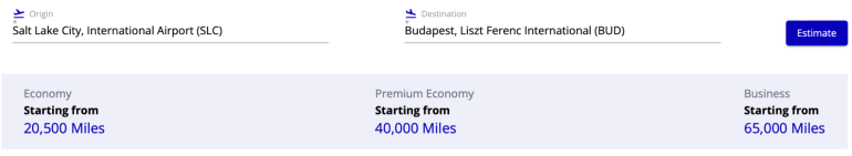 For example, say you want to fly from Salt Lake City to Budapest, Hungary. According to the Miles Price Estimator, the lowest redemption level is set at 20,500 Flying Blue miles for a one-way ticket in economy and 65,000 miles for a one-way ticket in business class.