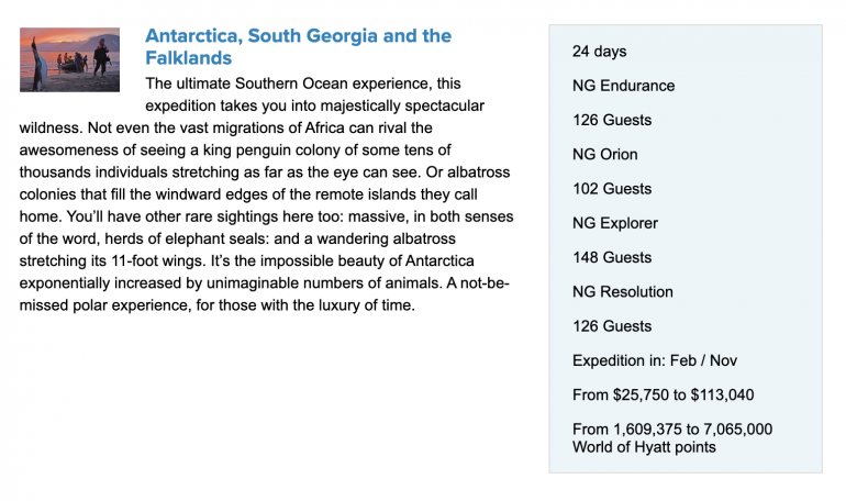 For example, this 24-day Antarctic cruise starts at either $25,750 or 1.6 million Hyatt points: