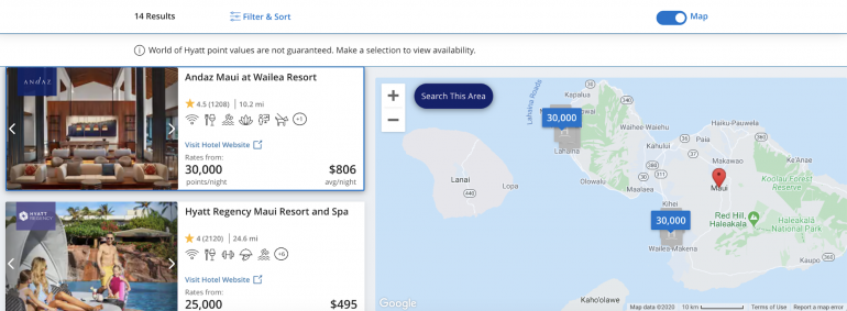 Both the list on the left and the map on the right seem to indicate that rooms are available using points. However, navigating through to the Andaz Maui room selection reveals this: