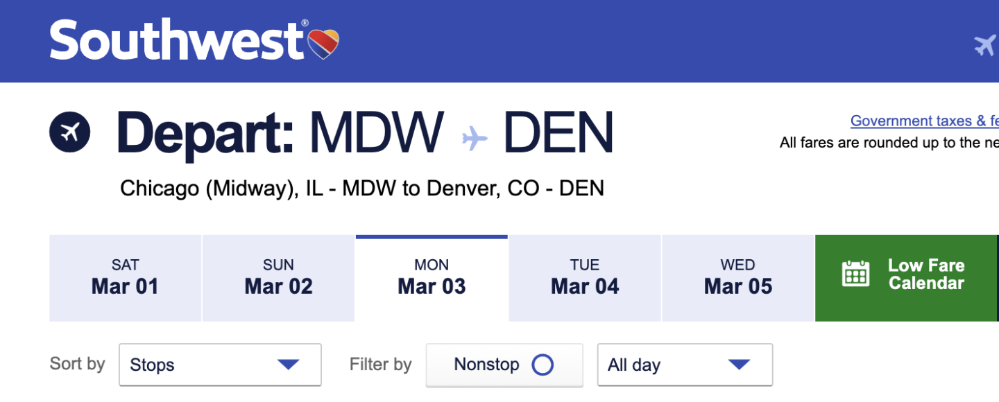 The next screen will display the lowest-cost flights available per day. You can then click into a date one-by-one to see which flight operated that day is the cheapest Southwest flight.
