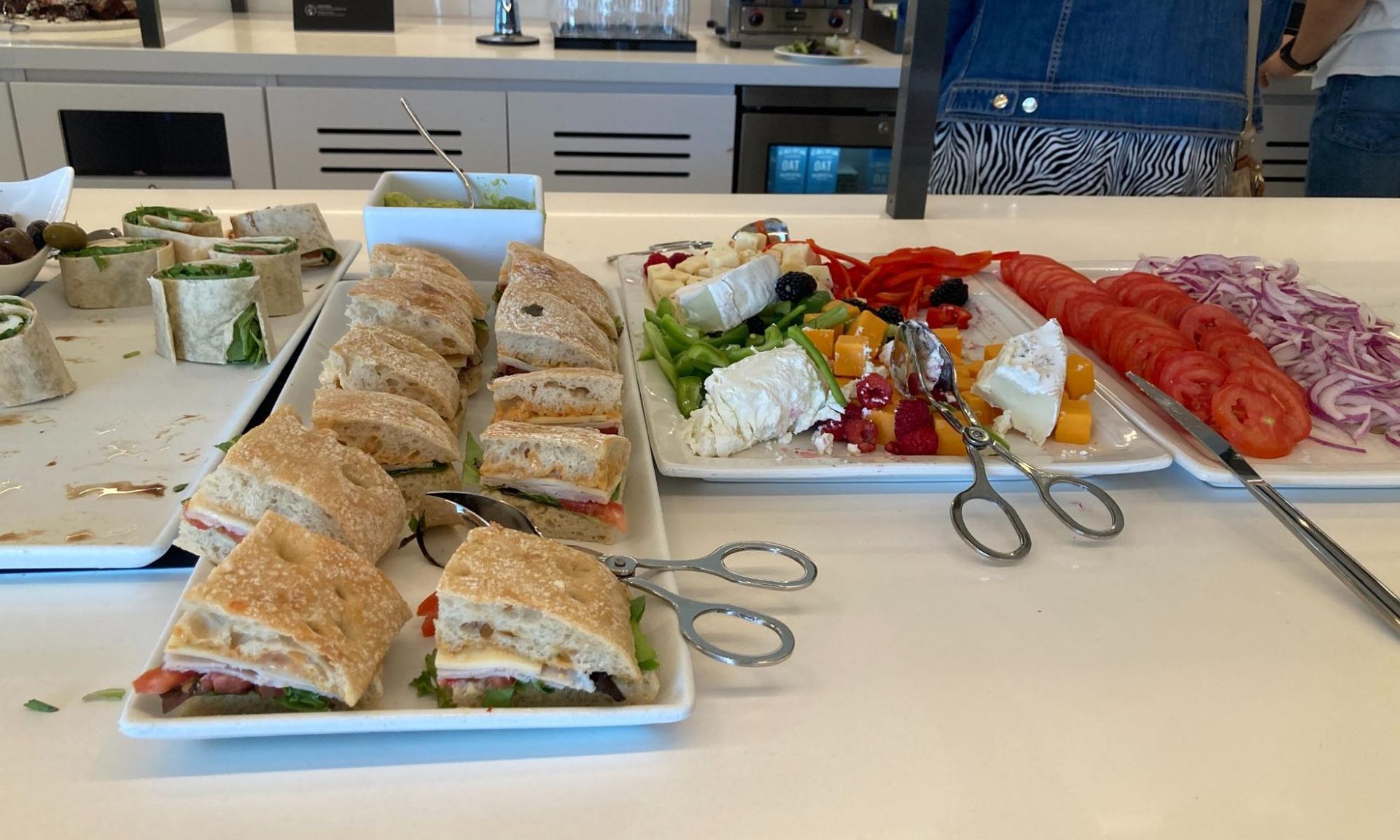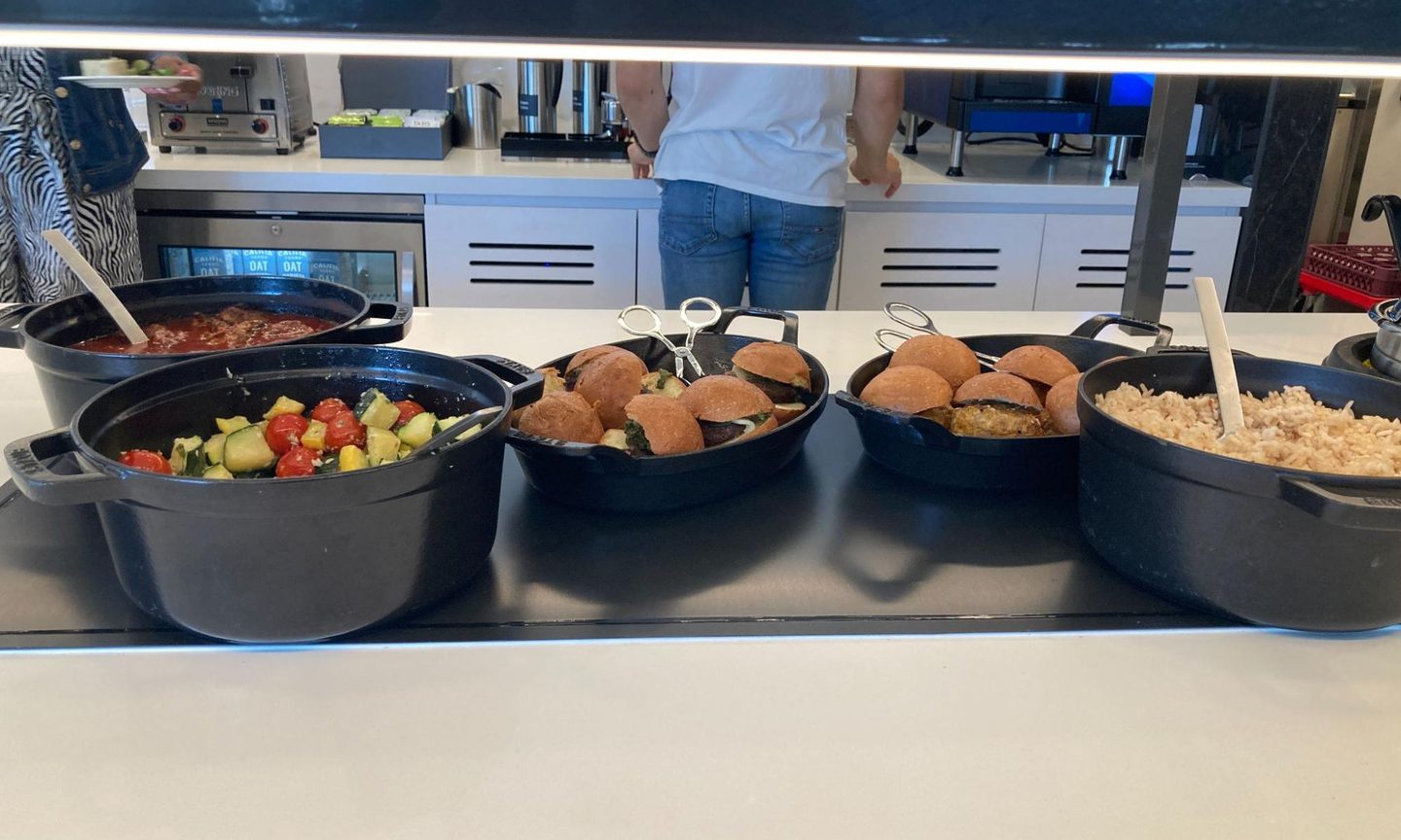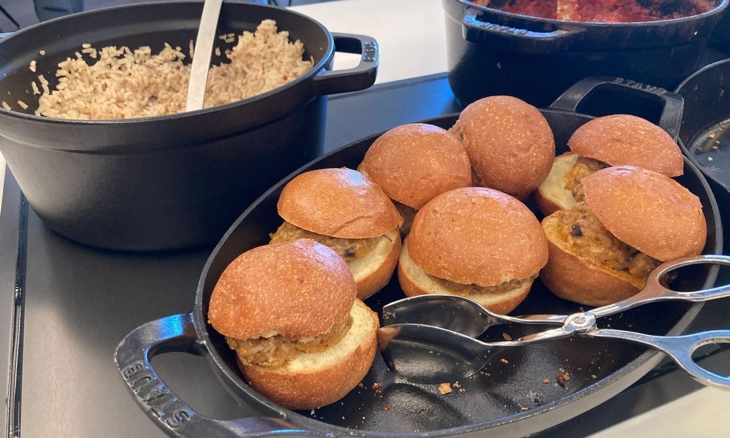 The buffet supports vegetarians and carnivores alike via chimichurri beef sliders and black bean sliders.