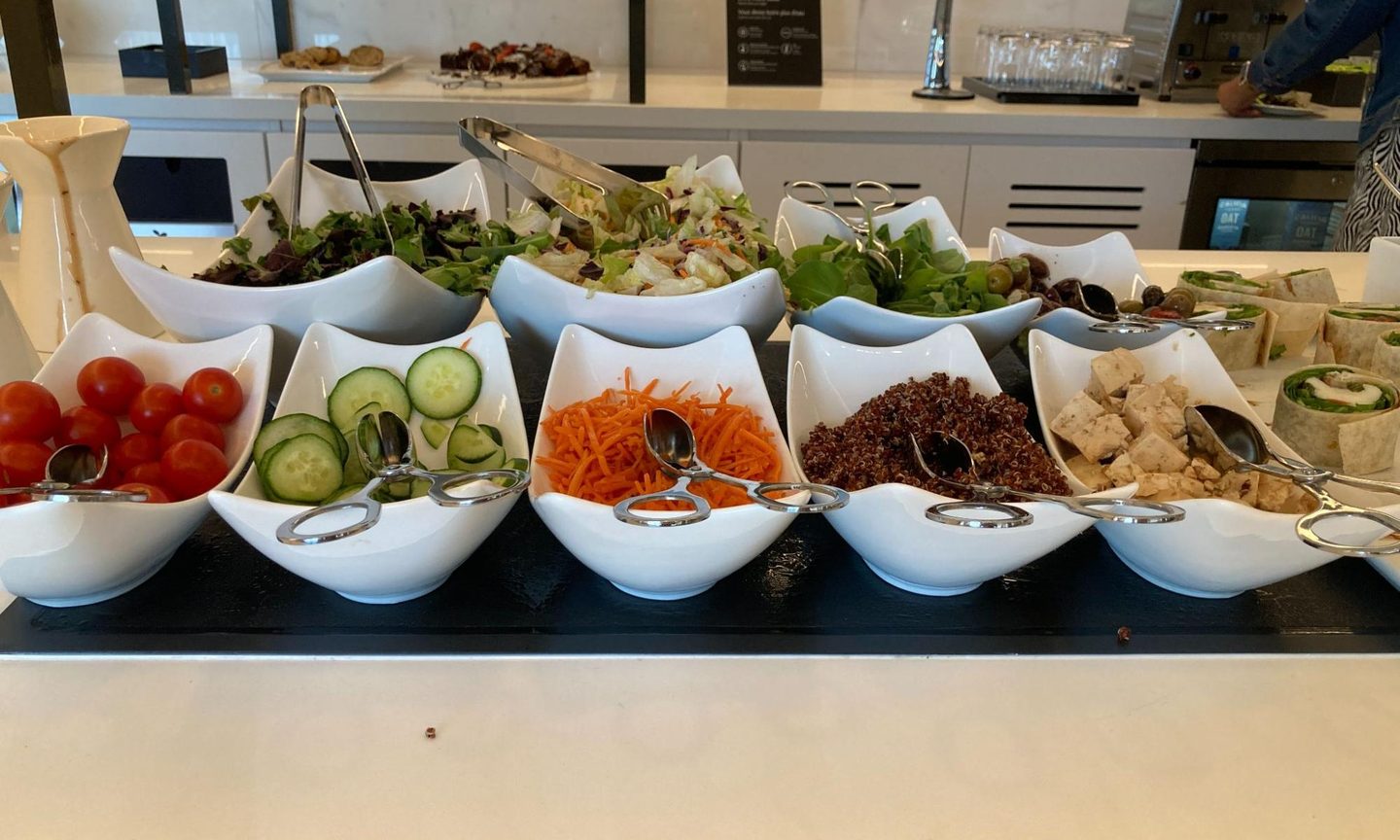 The self-service buffet starts with a salad bar, which includes your usual suspects of toppings like carrots, tomatoes, quinoa and cucumbers.