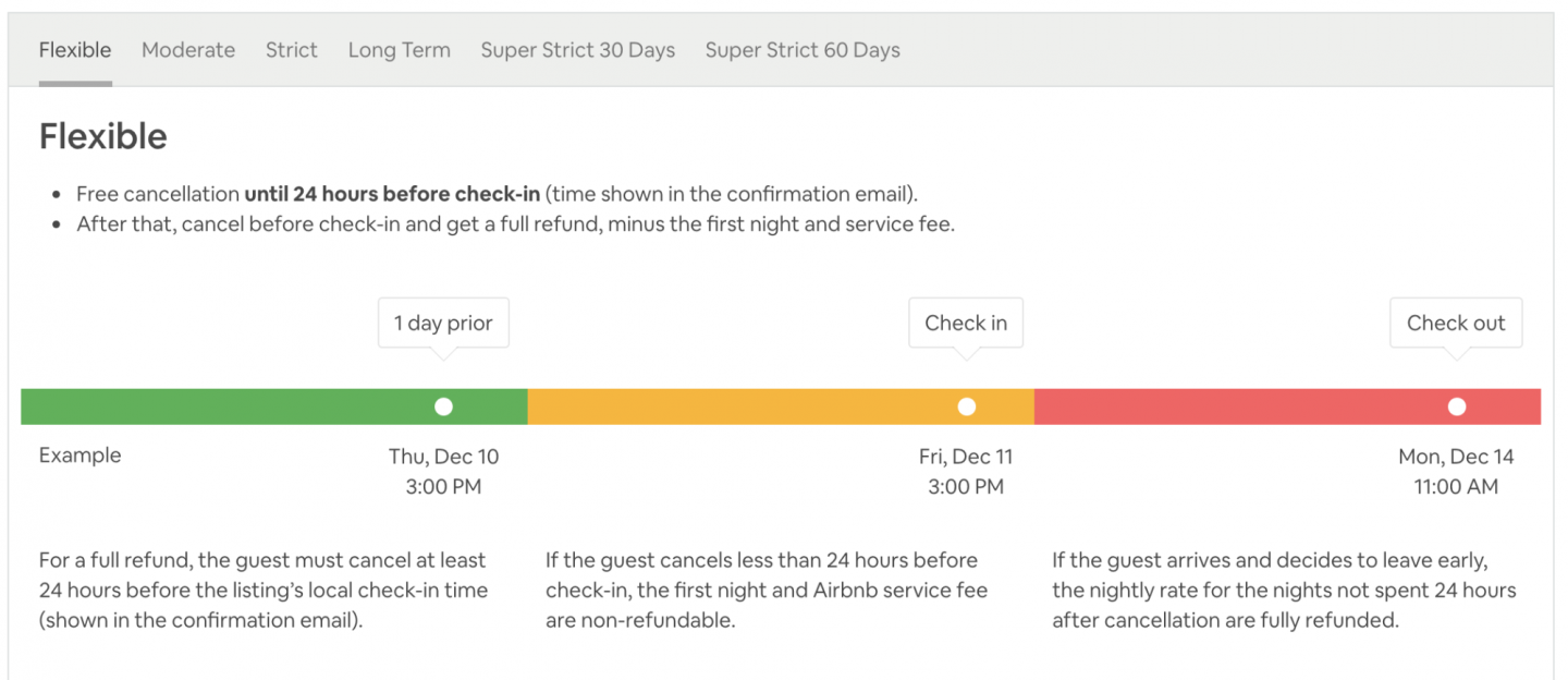 Airbnb lets hosts choose from several preset flexibility policies, ranging from “flexible” to “strict.” Each policy features a color-coded timeline to help potential guests make sense of it.